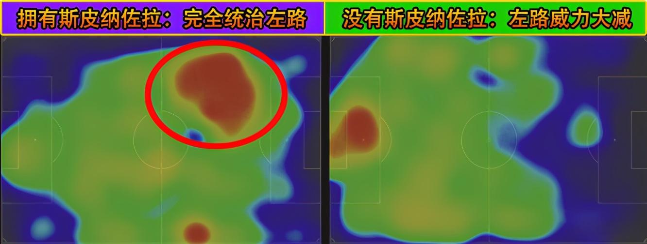 大家对比下这两张热度图,有斯皮纳佐拉的意大利,左路几乎是住在别人家门口的。
