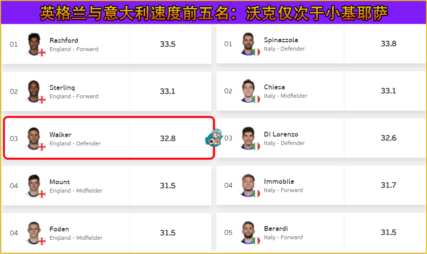 在那位伟大的意大利左后卫受伤后,意大利全队,只有小基耶萨的冲刺速度比沃克快一些,其它人都不如沃克。