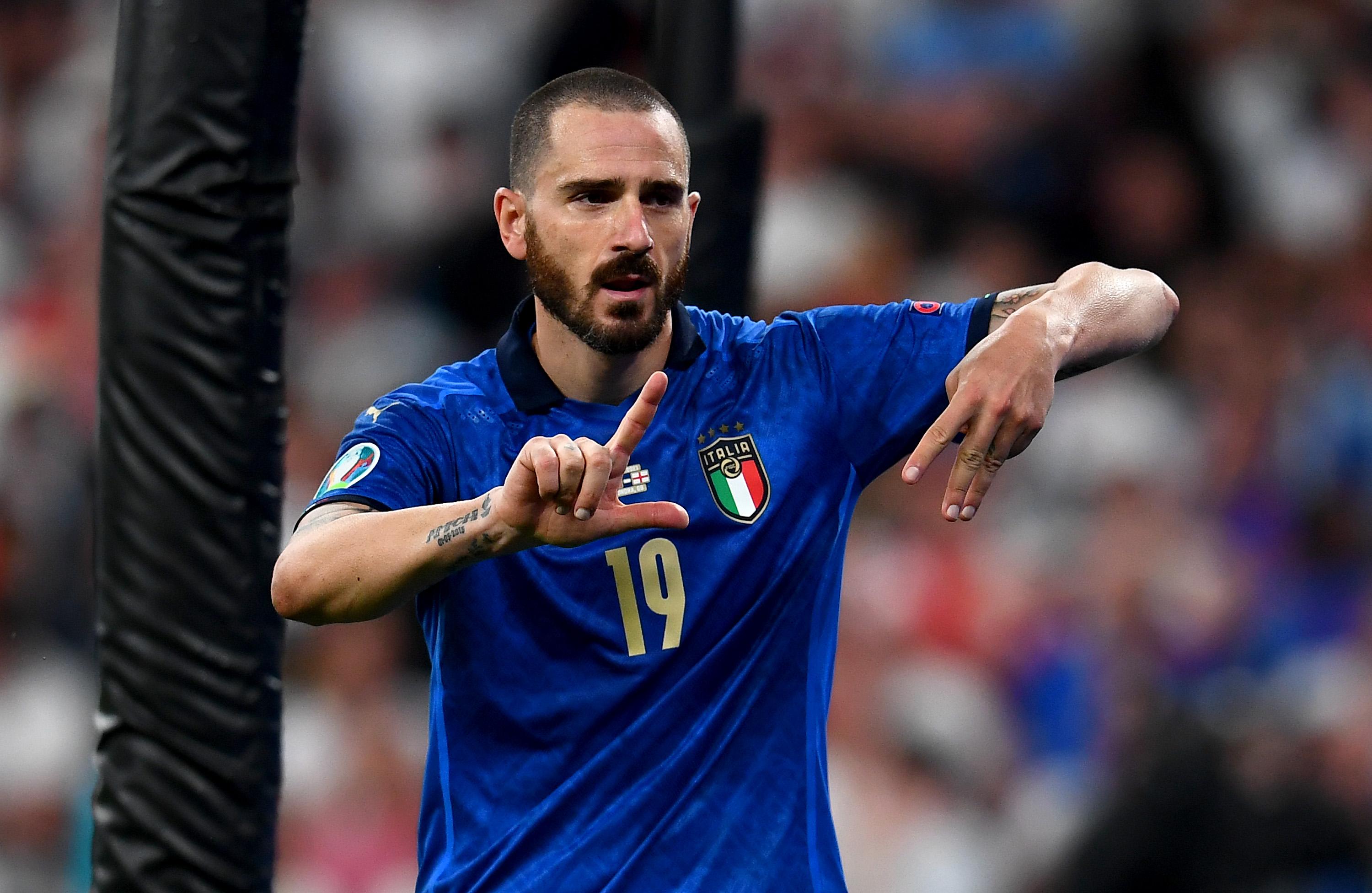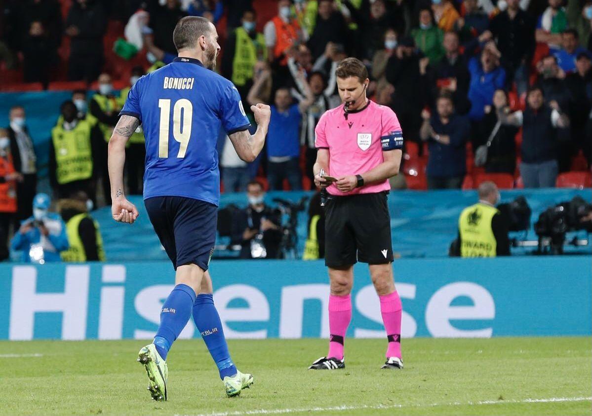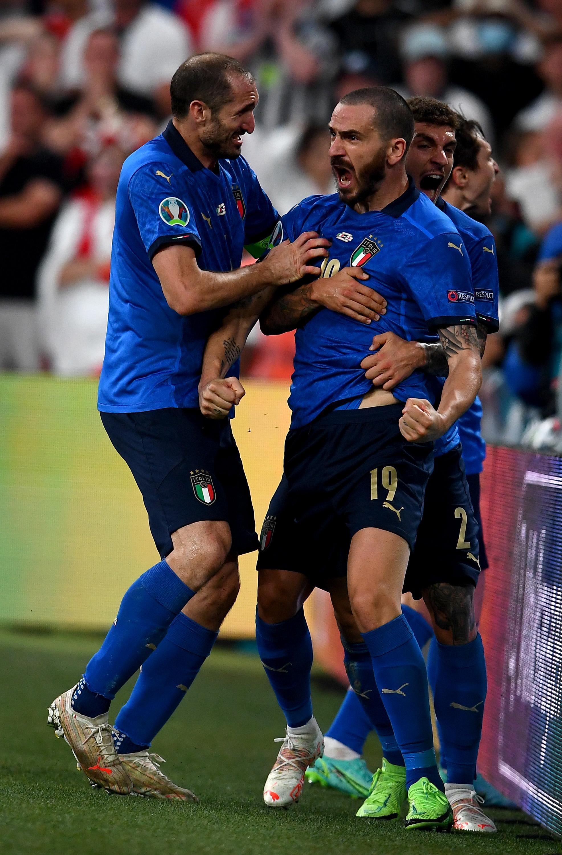 意大利队博努奇庆祝领先。上一轮比赛,意大利淘汰西班牙晋级。