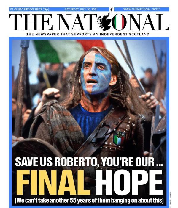 更有意思的是,苏格兰的《国家报》在封面上将曼奇尼PS成电影《勇敢的心》主人公,并公开写道:“救救我们吧,曼奇尼,你是我们最后的希望。我们实在无法忍受下一个55年他们(英格兰)的喋喋不休。”