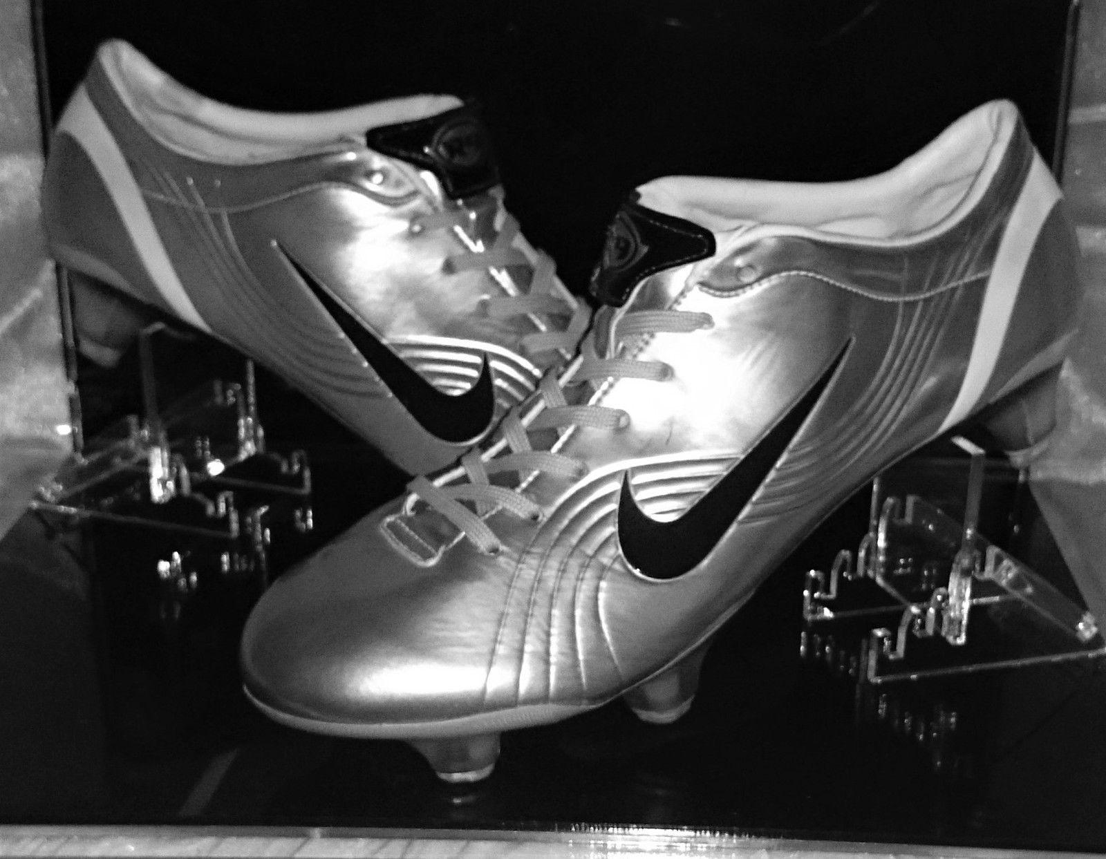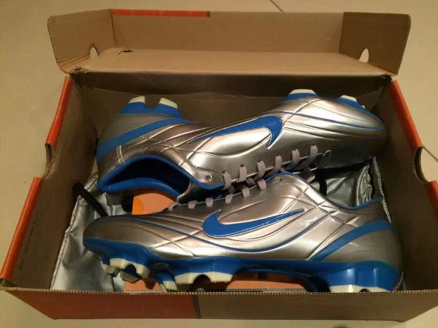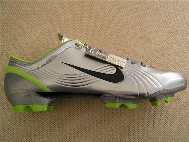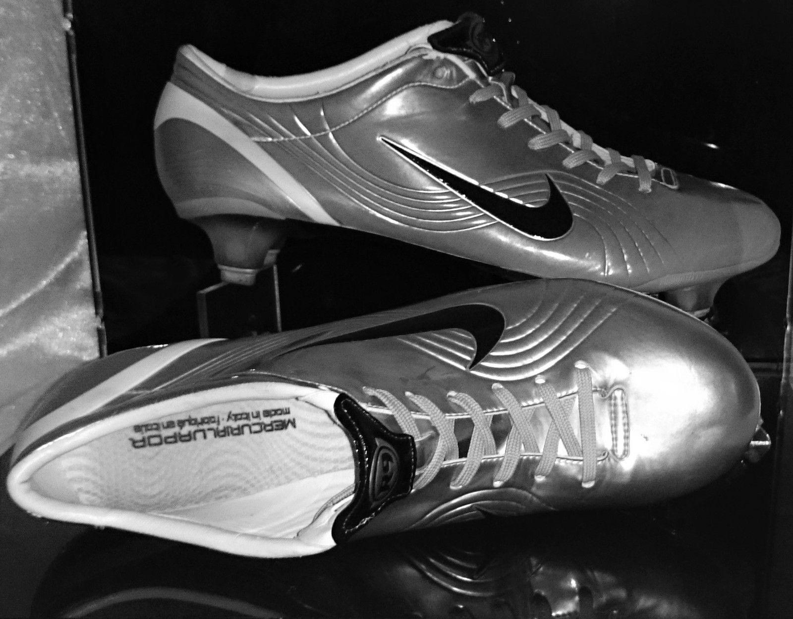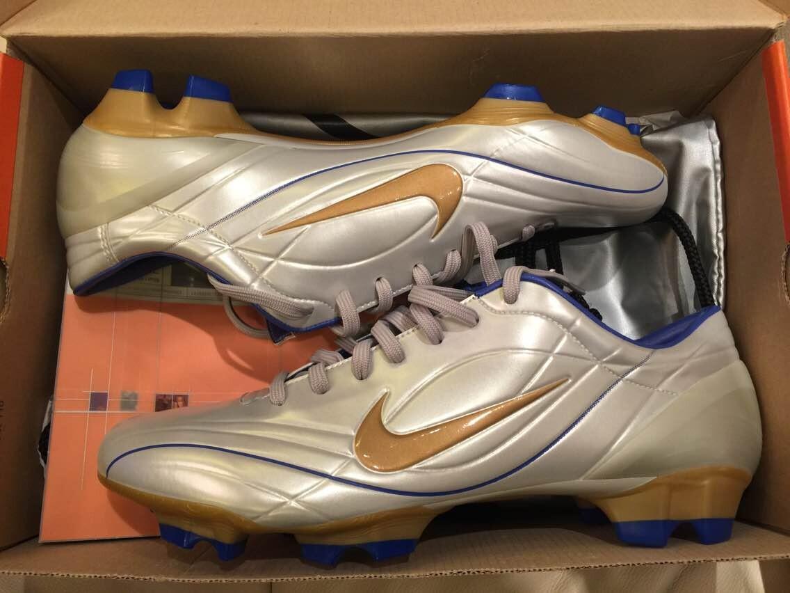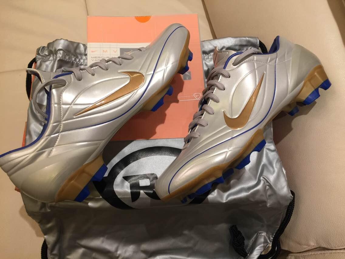 2000年,水星系列发布了第二款全新的足球鞋,match mercurial,这款鞋采用了全新的鞋底,让鞋子的启动力有了新的提高,鞋舌采用彻底的短舌设计以减轻重量。配色还是相对低调,以黑色为主。无奈大罗因为膝盖的伤情,长期休战。Nike 为其推出的银色r9专属match mercuiral,他只能在养伤期间穿着参加慈善赛。而2001年底复出后罗纳尔多的故事大家都知道,国际米兰在联赛遥遥领先的情况下,最后丢了冠军?还排名第三……这事是不是应该怪穿着古铜色战靴的罗纳尔多,是不是换个金色的就好了。Nike也真是够绝的,有银有铜就是没有金,难怪冠军旁落了。