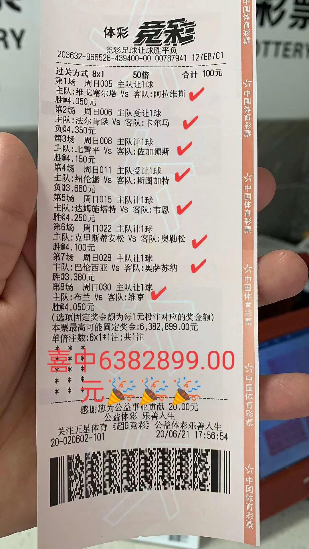 利物浦提前七轮夺冠,是英超史上最早产生的冠军,也是最迟产生的冠军。传统足彩14场20008期上周也在时隔3个月之久的漫长等待后开奖了,成为中国足彩史上时间跨度最长的一期。不过20008期整体难度适中,没有杀伤力特别大的冷门,总计开出了8注头等奖,单注奖金近13万元。而在松江区西林北路1761弄1号体彩20602网点,上周开出了一张竞彩足球8串1的超级大奖,100元的单子喜中6382899元,购彩者实力超群。