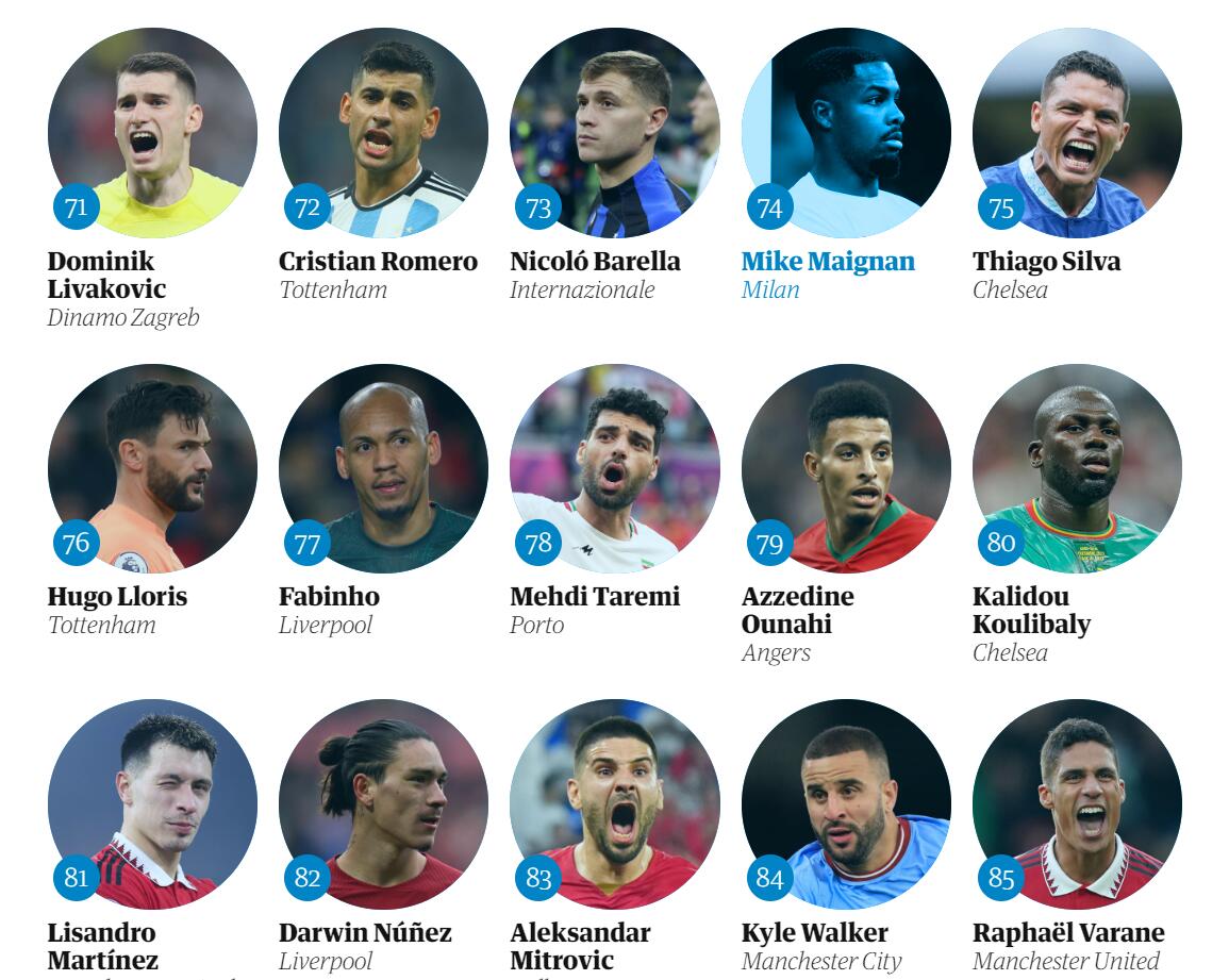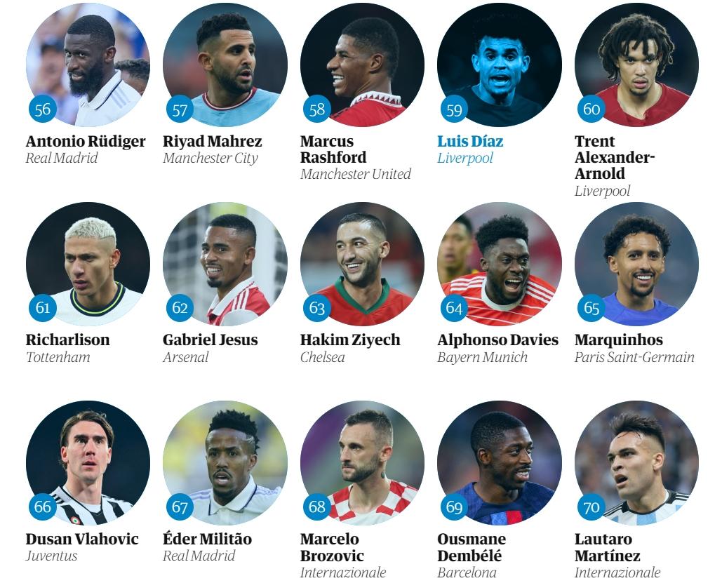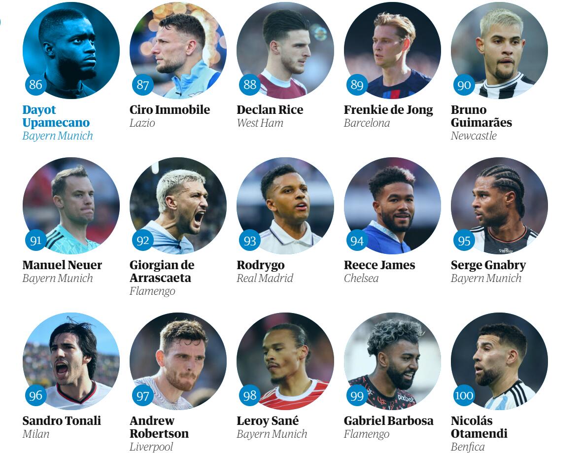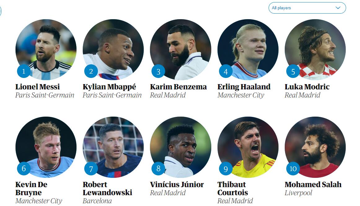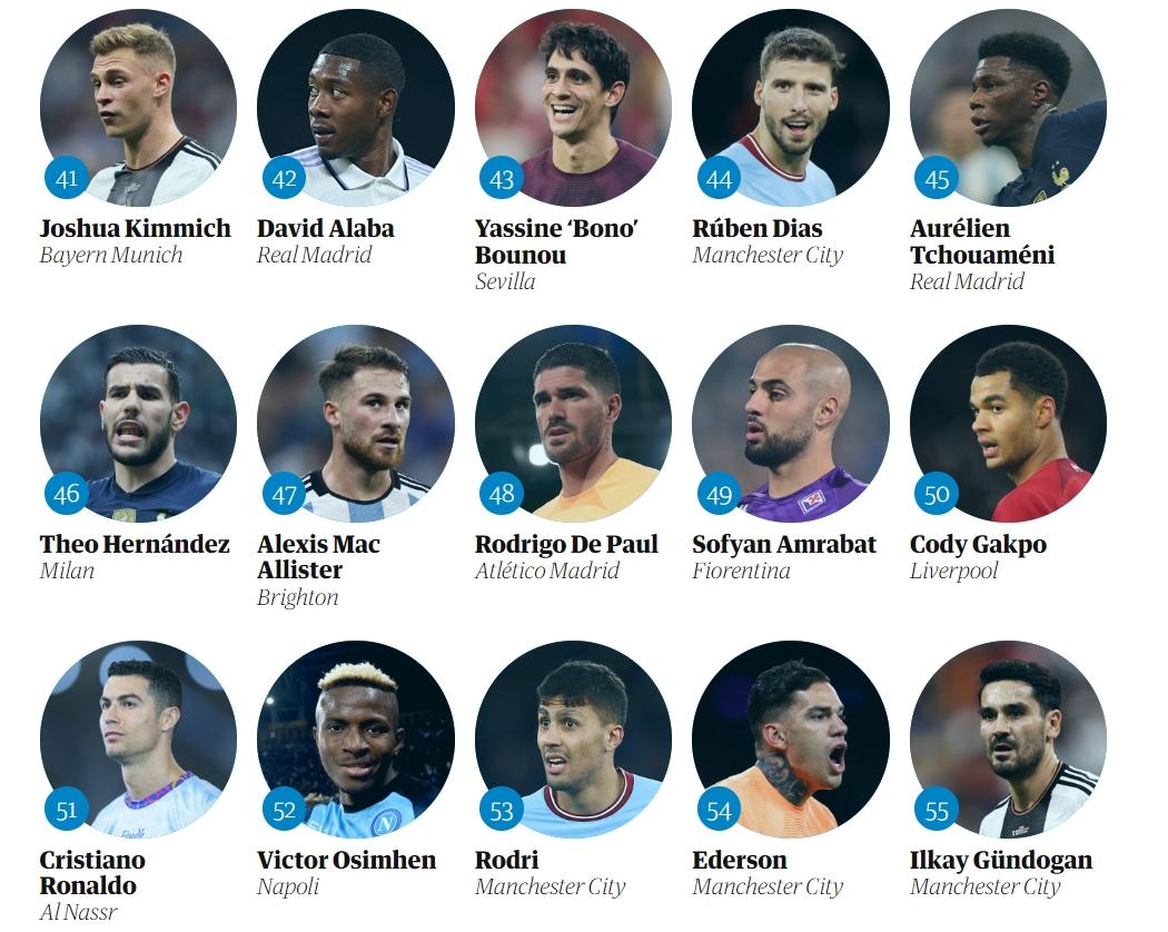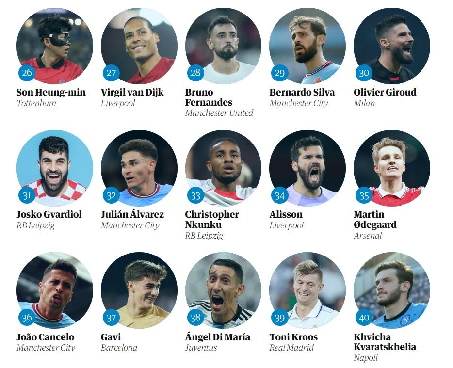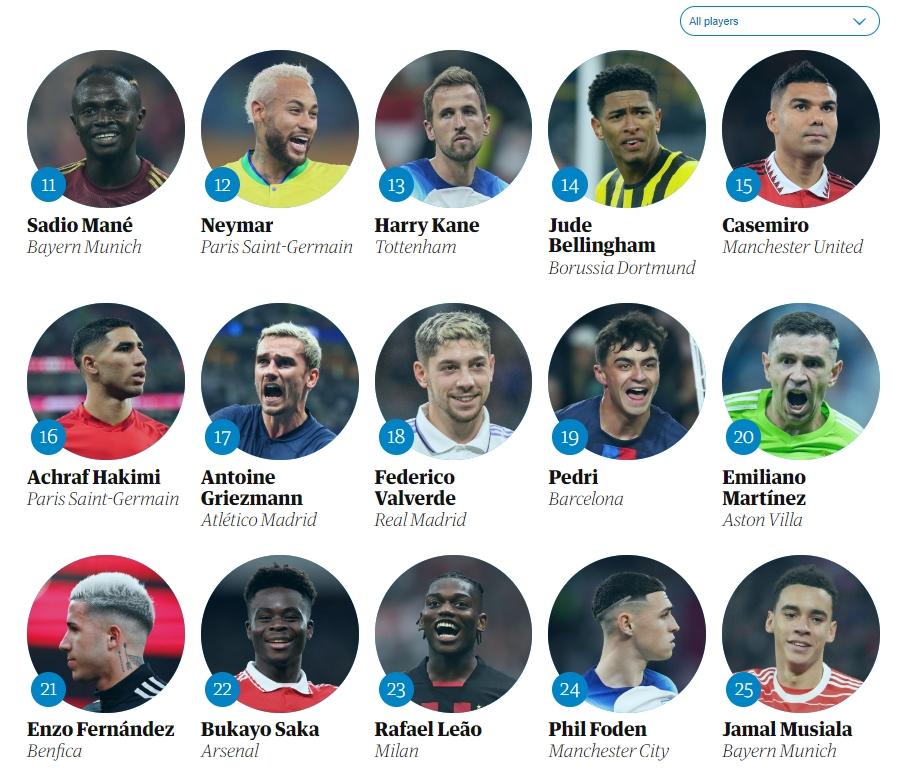 卫报每年都会进行百大球员的评选,评选由评委投票决出排名,每名评委将选择自己的2022年前40名球员,排名第一的的40分,排名第二的得39分,以此类推,排名第40的得1分。任何进入榜单的球员都必须得到至少5名评委的投票。