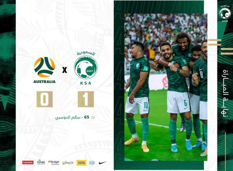 北京时间3月30日凌晨2点,2022年卡塔尔世界杯亚洲杯预选赛12强赛最后一轮,沙特队主场对阵澳大利亚。上半场,博伊尔单刀破门越位在先。第65分钟,多萨里主罚点球命中,沙特队1-0领先。最终,沙特队1-0击败澳大利亚,7胜2平1负积23分,以小组第一的身份晋级世界杯。澳大利亚排名小组第三,将与阿联酋通过附加赛争夺世界杯门票。