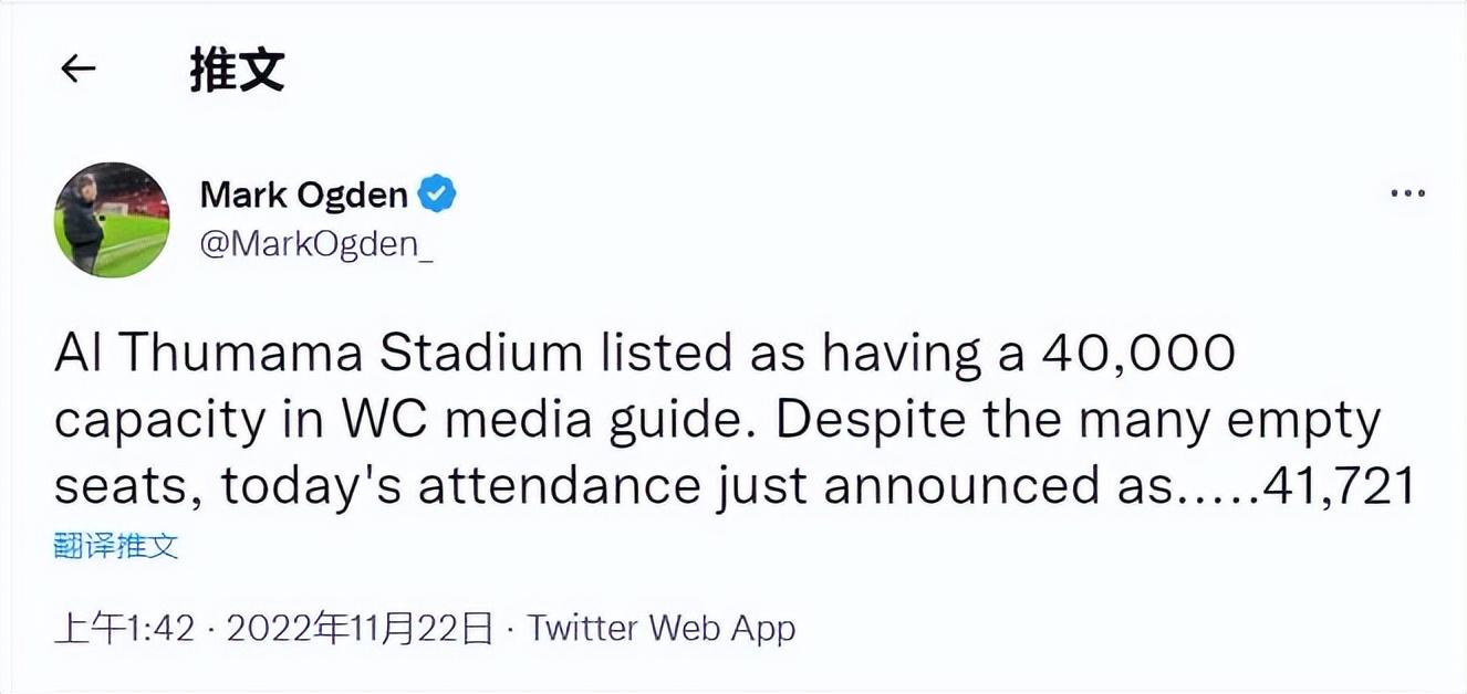 ESPN记者奥格登也发出同样的疑问:世界杯媒体指南中,说球场的容量为4万人,尽管有很多空座位,但官方宣布有41721名球迷入场……