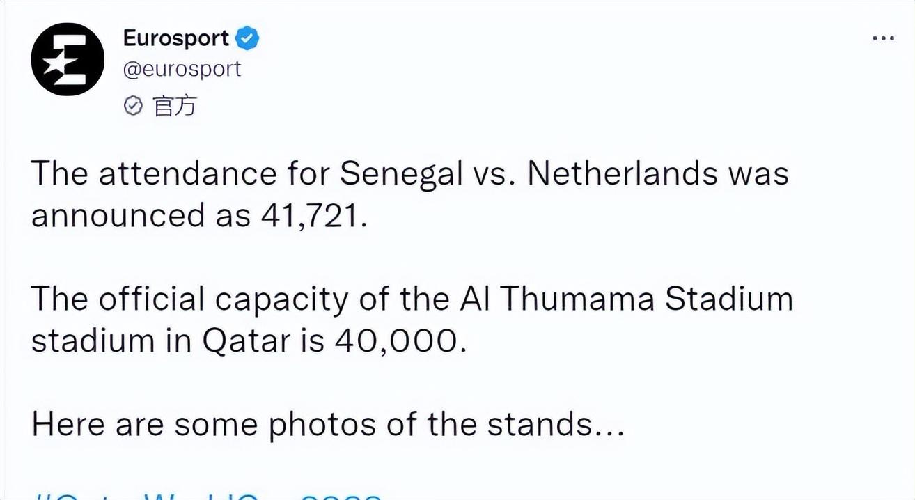 世界杯小组赛A组第1轮,范加尔执教的荷兰,以2-0战胜非洲冠军塞内加尔,收获世界杯开门红。这场比赛在阿图玛玛体育场进行,按照官方统计,到场观众数量为41721人。不过,多家媒体和记者质疑:这上座人数,有点虚幻。