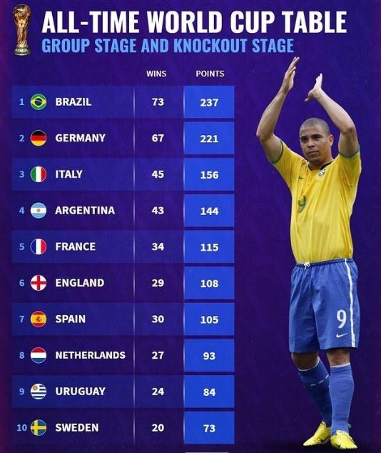 直播吧11月17日讯 世界杯即将来临,《转会市场》统计了各队在世界杯的总积分情况,巴西、德国分居前二。