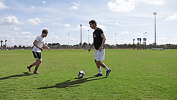 如果防守队员上前封堵传中线路,我们用脚内侧切球将球从腿后变向。