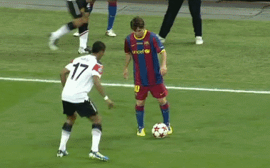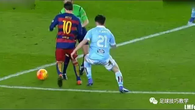 然后用脚背推球向另一个方向,这是梅西的拿手绝活。