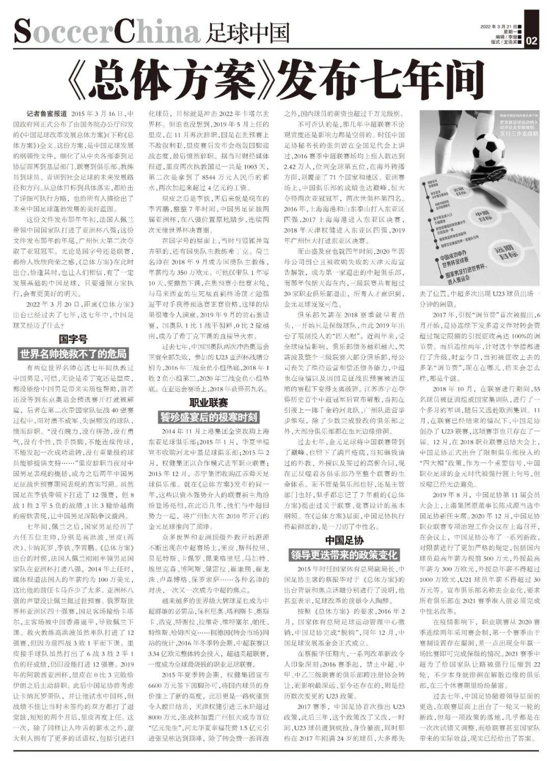 极端批评者甚至断言,中国足球没戏,那是因为他们认定中国足球找不到正确的发展之路。但事实上,早在2015年,中国足球发展的纲领性文件《中国足球改革发展总体方案》(下称《总体方案》)就已经发布,从2015年3月16日至今,这份文件已经发布了七年,遗憾的是,七年来,中国足球各界包括中国足协,对《总体方案》的贯彻执行并不彻底。