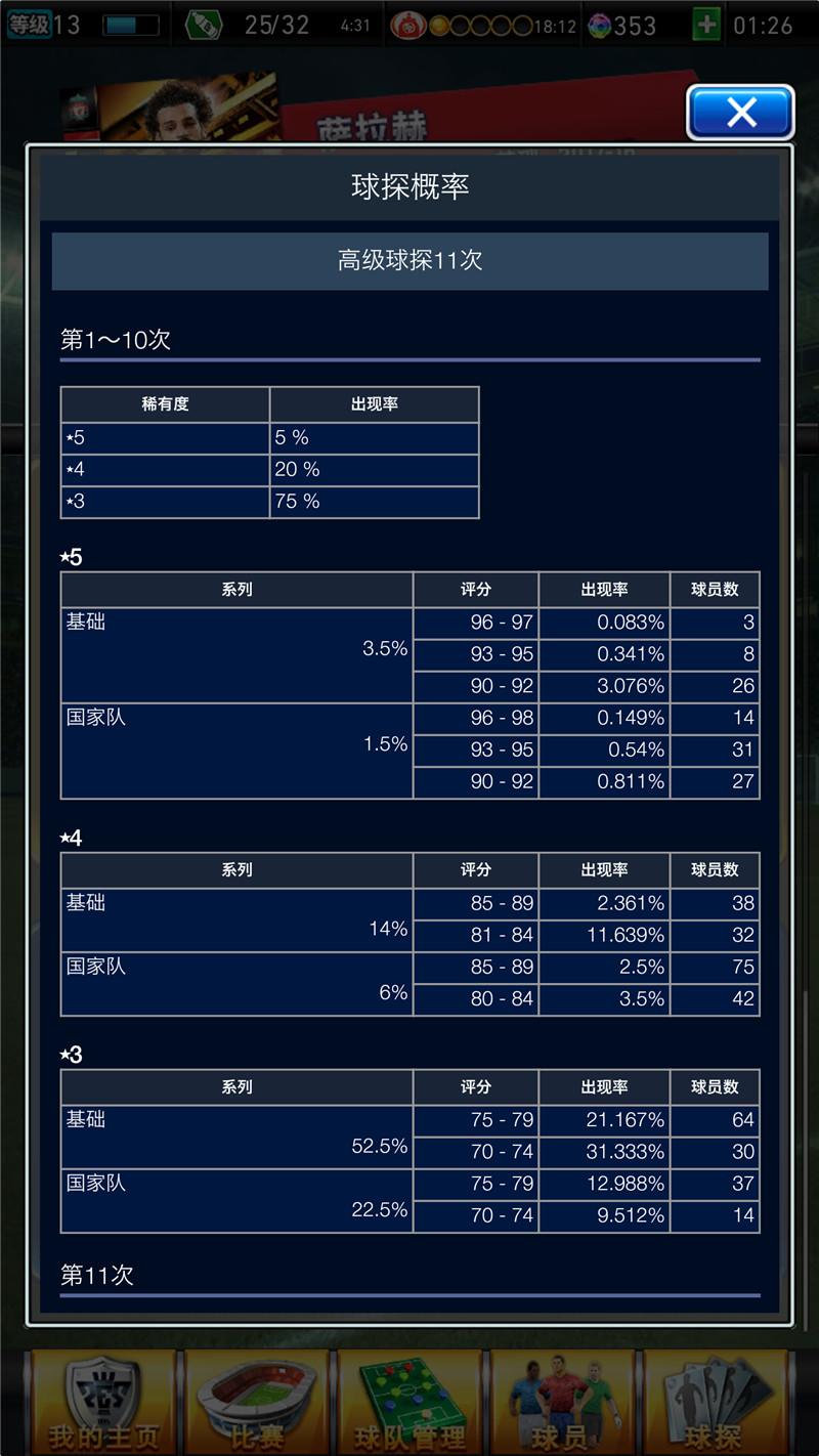 由于足球是一项11人的运动,玩家需要更多强力的、熟悉的球星才会对游戏更有参与感,《王者集结》对GACHA中90能力以上5星球员的爆率设置的相当慷慨,5%,偶尔有活动还会达到10%,因此抽卡体验相对常见日系手游是更加出色的。
