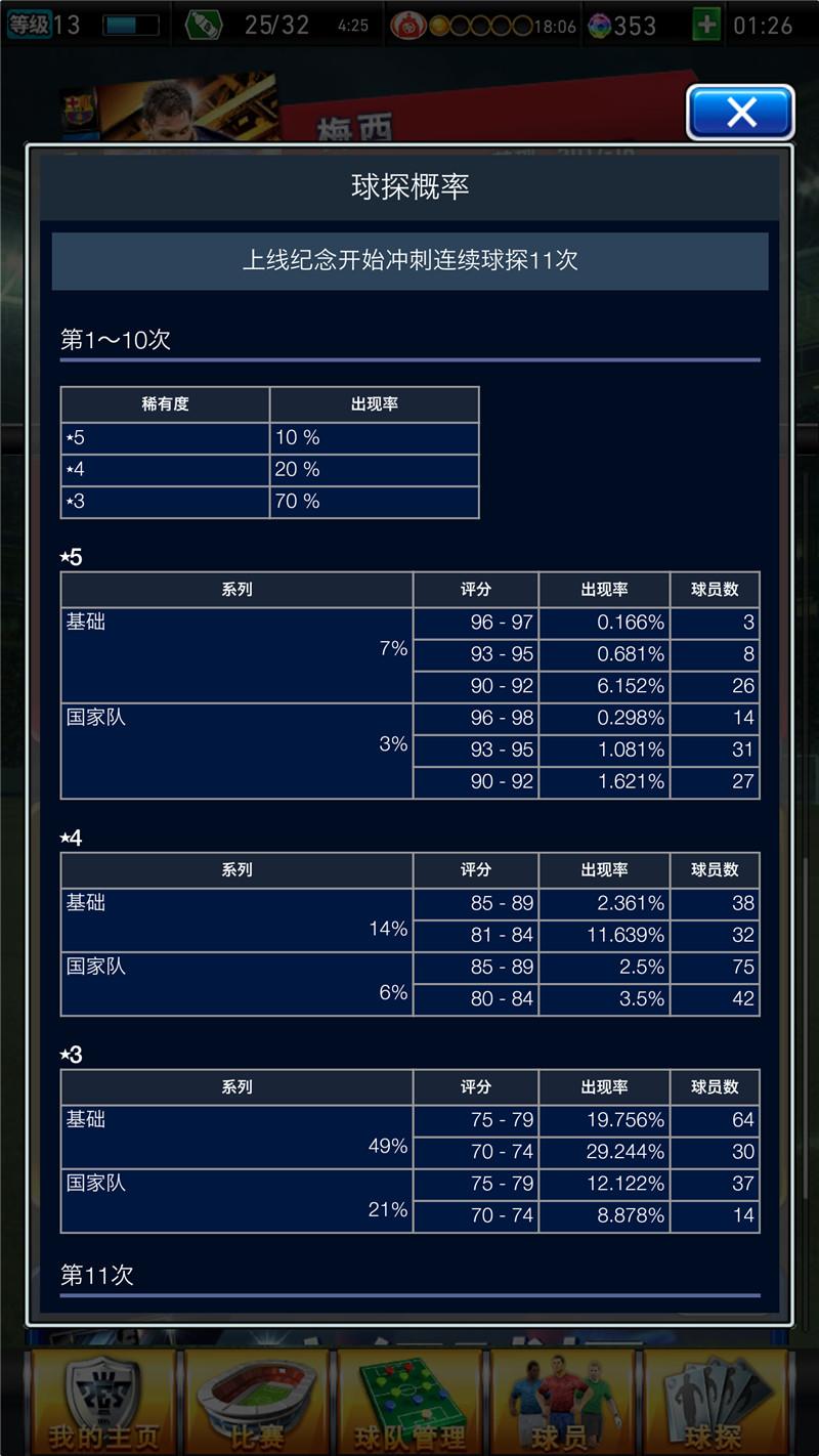 KONAMI对新手任务的设置是相当有技巧的,只要玩家能够勉力在游戏的头几天合理消费体力,努力打比赛升到20级左右,轻易就能获得多张高能力值球探券,并且攒出超过750钻进行三次五星球员爆率10%的新人限定GACHA11连,只要运气不是太烂,每个玩家度过新手期至少都会有随机组合的4~5名5星球员,让培养与留存更有动力,也让对战中的玩家能够感知彼此阵容的差异性,这一点要强于国内多数卡牌手游