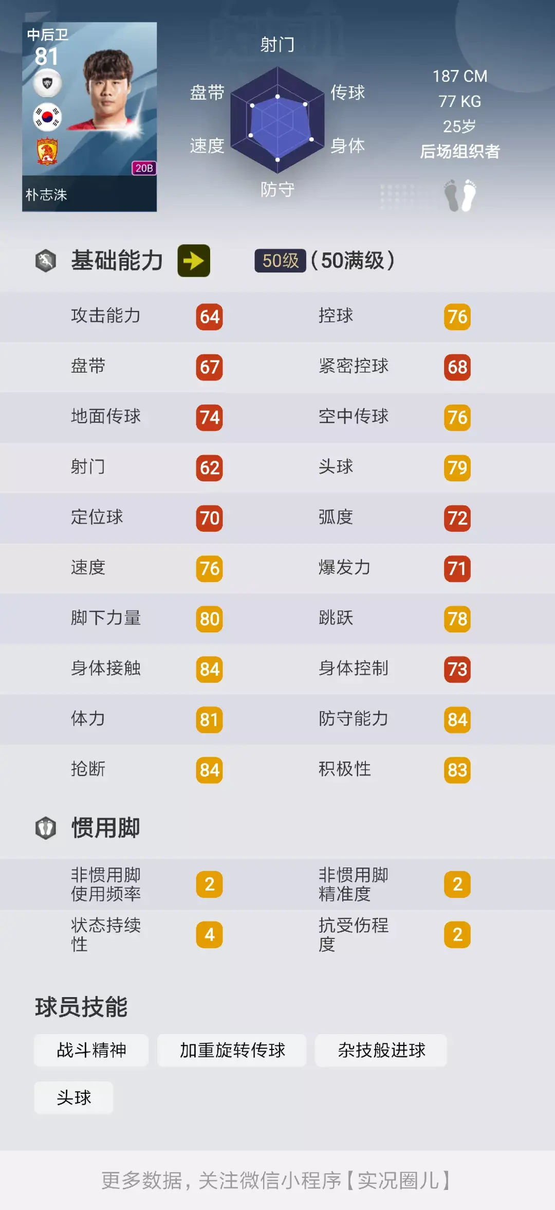 再说中卫吧,恒大有五个中卫,布朗宁、高准翼、冯潇霆、朴志洙和梅方,其中最好用的应该是朴志洙,双防过关、身高够用身体够壮,唯一缺点是速度慢了点,但是实操时完全感受不到速度的劣势,布朗宁的进攻数据会更好但是在后防用不上,冯和梅的话就更方面数据都会差一点了,高双防并不算好但身体接触是最好的,而且他有左后卫的位置熟练度能在李学鹏状态不好时顶上。