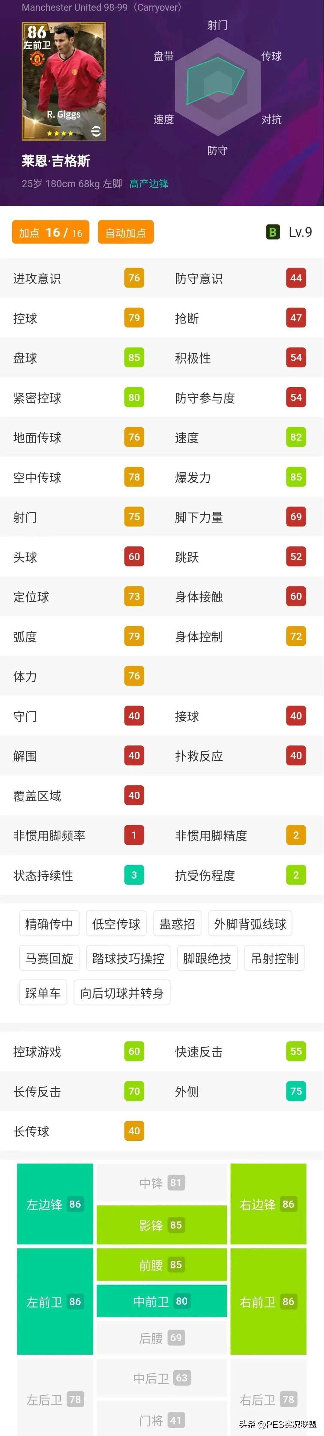 球员简析:吉格斯属于降级卡,在新引擎游戏中变成了四星传奇,现在入手比较亏。