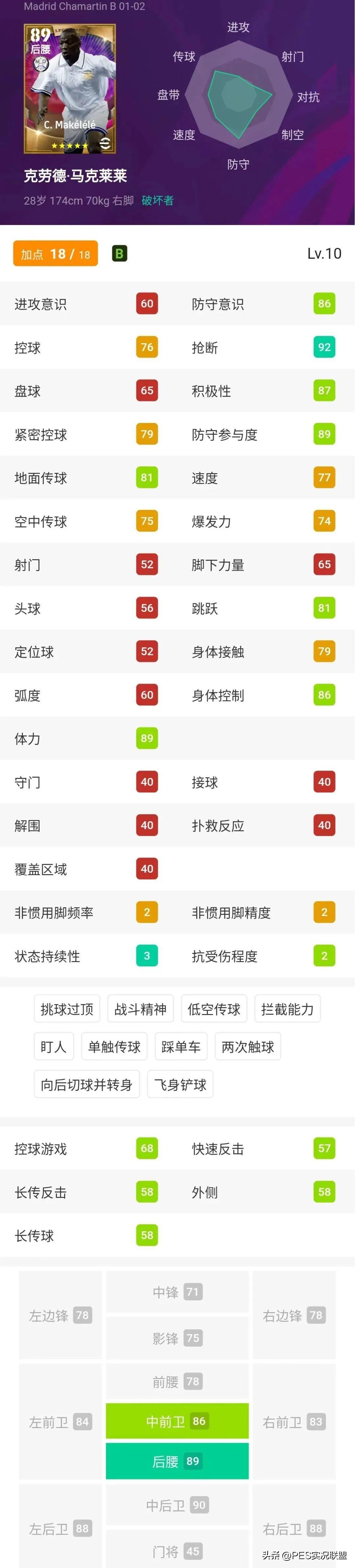 从新引擎球员的整体强度来看,传奇卡马克莱莱除了模型稍差之外,其它关键属性的确都是一流防守型后腰的水平。