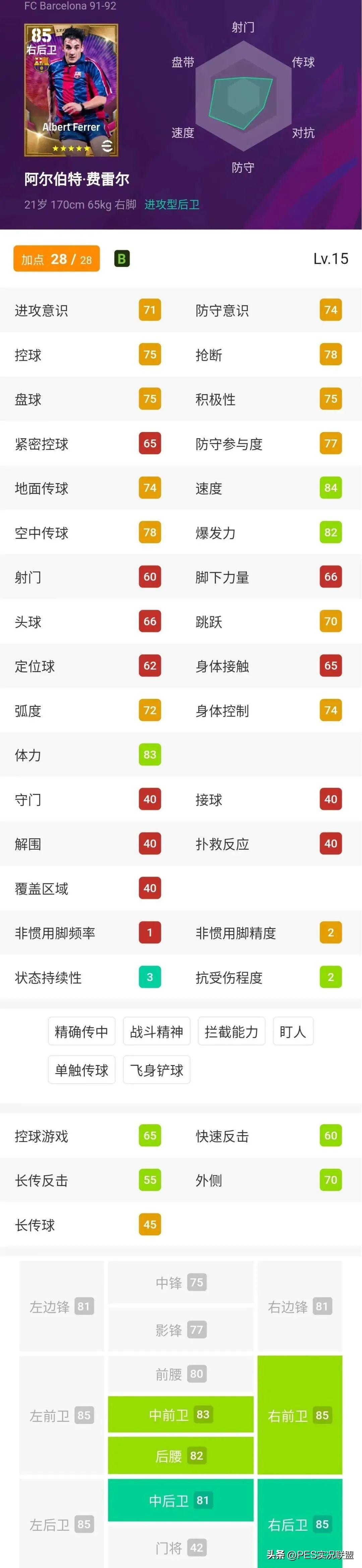 现在作为专职右后卫,费雷尔的传奇卡唯一拿得出手的数据就只剩下初始80+的双速,其它关键属性虽然也都在75左右,但跟以前的豪华数据相比判若两人。