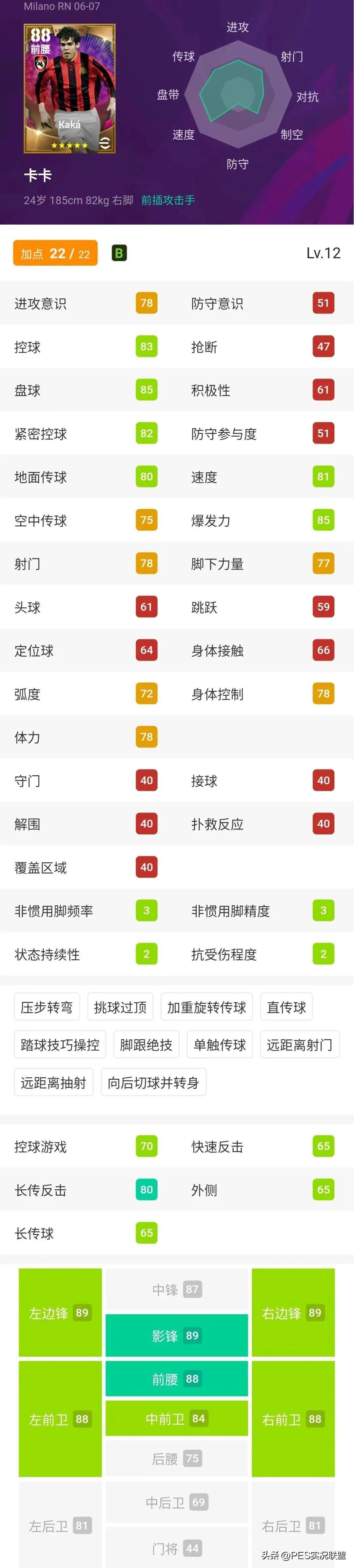 球员简析:不知看到这个数据,当初氪穿荣耀礼盒的大佬作何感想。毕竟新引擎继承的卡卡就是这个版本,旧引擎的时刻卡卡继承的也只能是这张高光卡。