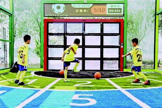 图为洪山杨春湖智能社区足球场,孩子们在玩射门游戏