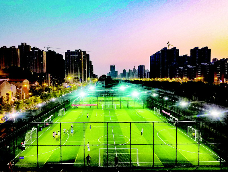 图为汉阳磨山港湾足球场,居民们在灯光下踢夜场