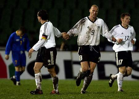 经历过这一系列的打击,扬克尔的意志被磨炼得向他的肌肉一样结实,终于,他坐上了国家队主力中锋的位置。2002年世界杯,本该是扬克尔扬名国际赛场的最佳时机,然而经过三场小组赛之后,他却在替补席上看完了余下的比赛,亲眼见证了克洛泽接过了改朝换代的接力棒。