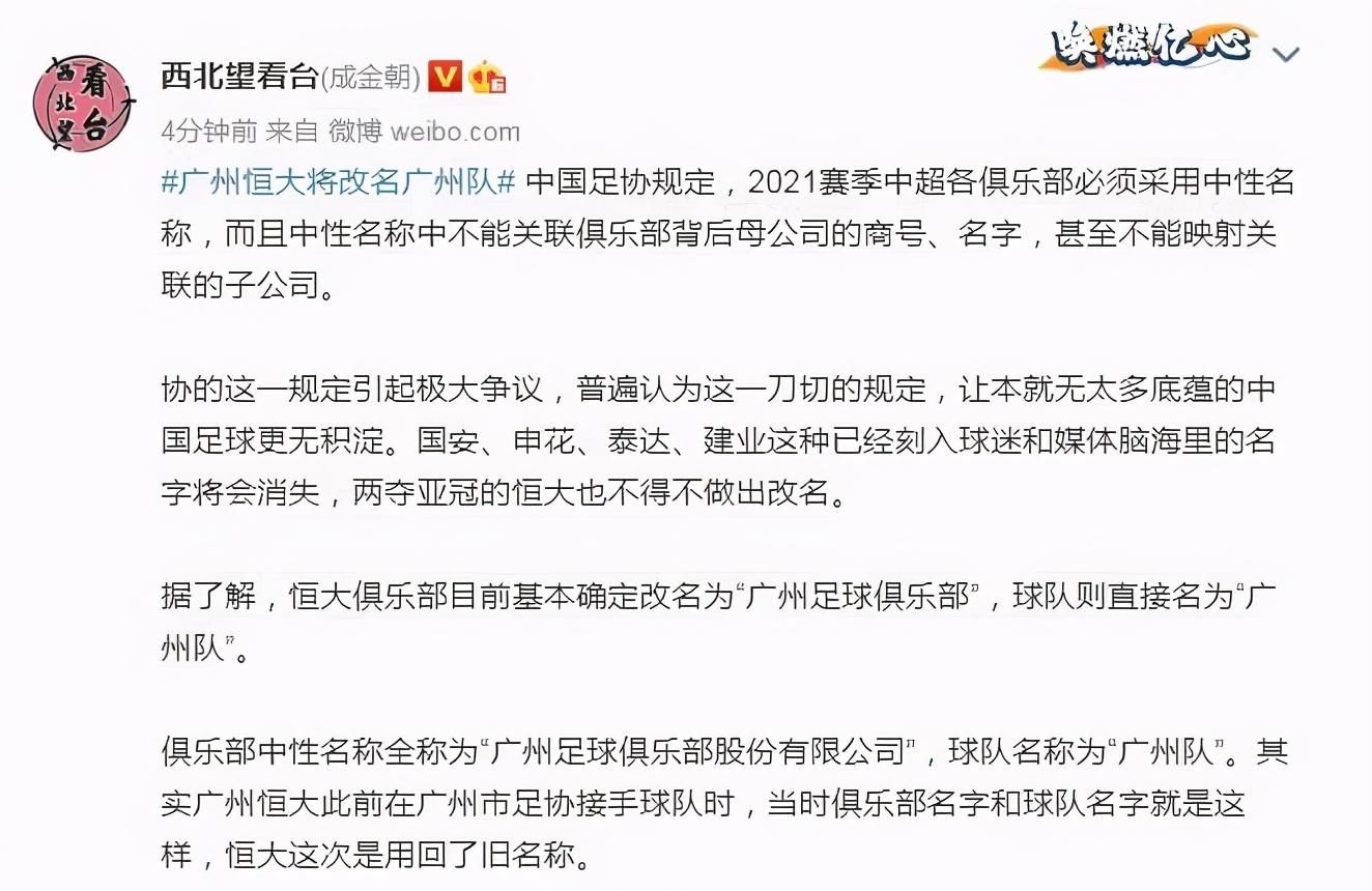 不过,现在剧情有些反转,就是又有新的队名曝光。记者成金朝今日突然爆料广州恒大俱乐部基本确定改名为“广州足球俱乐部”,球队名称改为“广州队”。与此同时,还强调广州恒大此前在广州市足协接手球队时,当时俱乐部名字和球队名字就是这样,恒大这次是用回了旧名称。