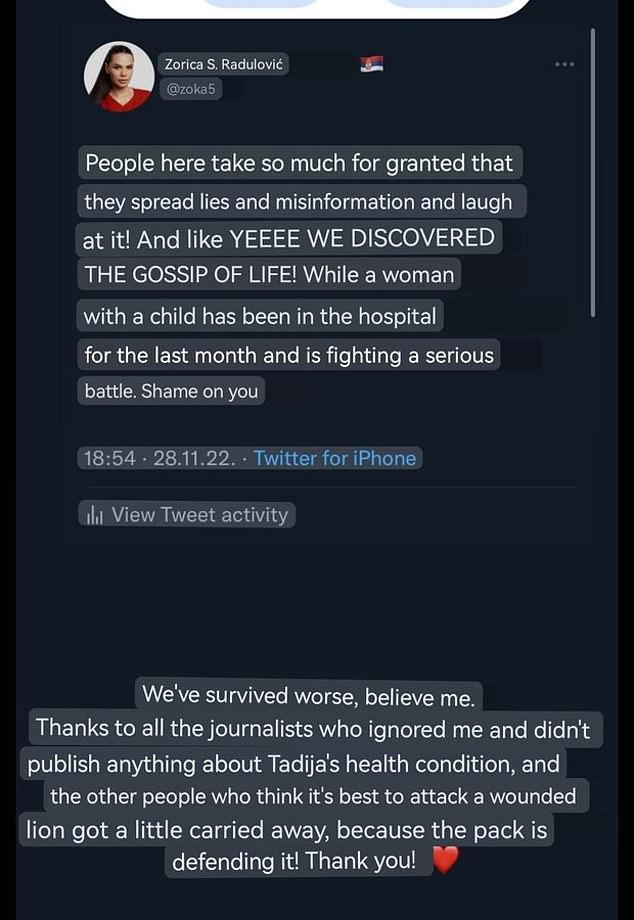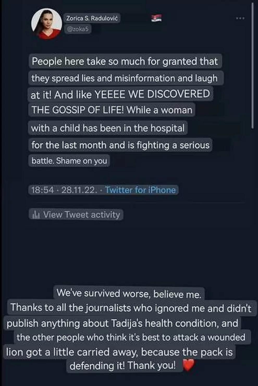 同时,事件的另一主角,拉伊科维奇的老婆卡基奇也在社交媒体上澄清,自己上个月一直在医院照顾生病的儿子,并没有出轨弗拉霍维奇。