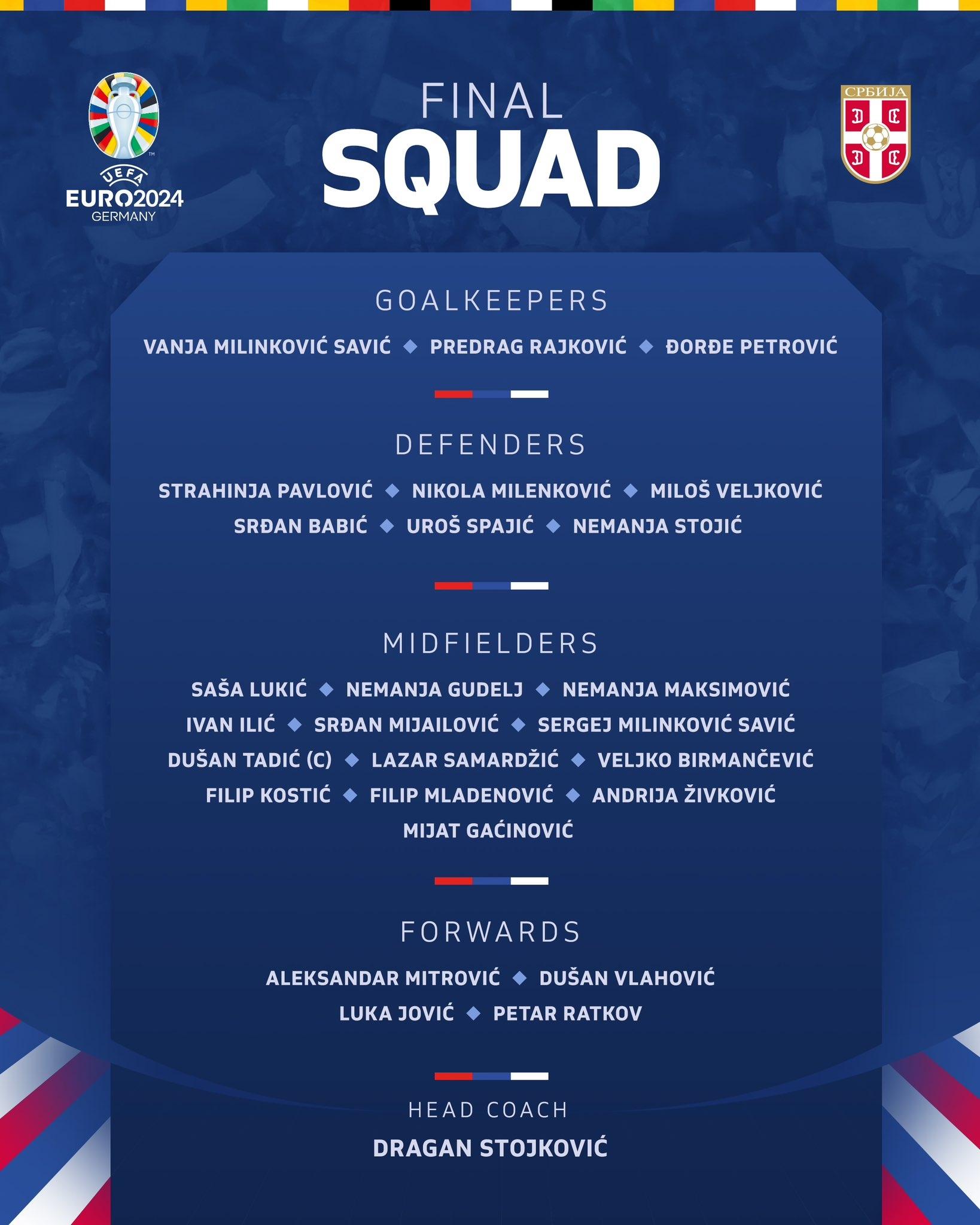 北京时间5月27日,塞尔维亚国家队公布了2024年欧洲杯的26人大名单,弗拉霍维奇、米林科维奇领衔,米特洛维奇、约维奇在列。