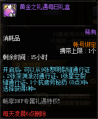 在这里要回答一下上面的问题了,之所以两种礼包相差800点券,主要体现在黄金礼遇礼包比白银礼遇礼包多了每日签到礼盒和累积次数的礼盒,每日签到礼盒只领一种,相对比白银礼包多出了60张星空裂缝通行证、70张派对通行证、270张黎明深渊派对通行证、30瓶八点疲劳药水。