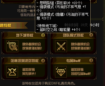如何评价DNF的礼遇特权 礼包 ?或者说是礼包,那就是DNF礼遇特权。在DNF...哈林地区深渊可以额外奖励,黎明裂缝异形碎片+22个,强袭模式污浊的不详气息+7个,强袭模式(隐藏)污浊的不详气息+21个...