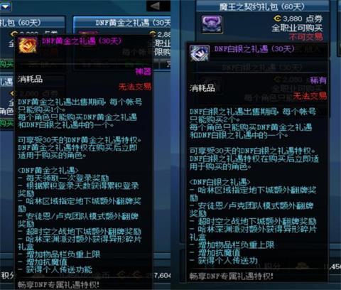 DNF自95版本大更新后推出了月卡礼包(分为黄金和白银两种),黄金礼遇礼包售价为2880点券,每个账号限购一个(代币券无法购买)、白银礼遇礼盒售价为2080点券(代币券无法购买)每个账号限购一个,单账号可购买黄金和白银礼包各一个。