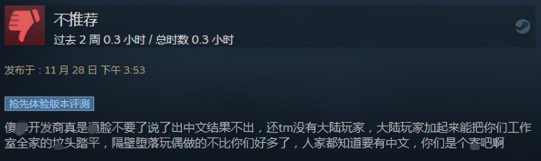 可见中国大陆玩家在游戏开发的过程中贡献并不少,然而马头社这一手过河拆桥属实是让广大中国玩家们都炸了,纷纷在Steam中点出了差评,目前《Subverse》30天内的差评率已经高达了79%。