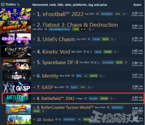 《战地风云2042》(以下简称《战地2042》)是DICE《战地》系列的最新作品。游戏在发售前凭借着玩家们的预购就已经连续拿下了几次Steam的周销量冠军。然而,在游戏发售后由于稀烂的武器平衡与各种奇葩的BUG,却让它直接被玩家们喷上了史上评价最差的Steam游戏排名前十。