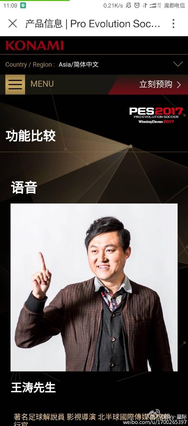 王涛曾经在央视多档节目担任足球节目主持人,《疯狂的足球》系列栏目让更多的人认识了他。目前王涛是北半球国际传媒首席执行官,同时也是一名影视导演。其实早在今年的7月份,王涛就已经在微博上暗示自己已经参与实况足球2017的配音工作,只不过当时没有得到科乐美的确认。近日,这一消息最终得到了官方的确认,实况足球2017的将会拥有王涛的中文解说。这次,王涛也算是转正了。
