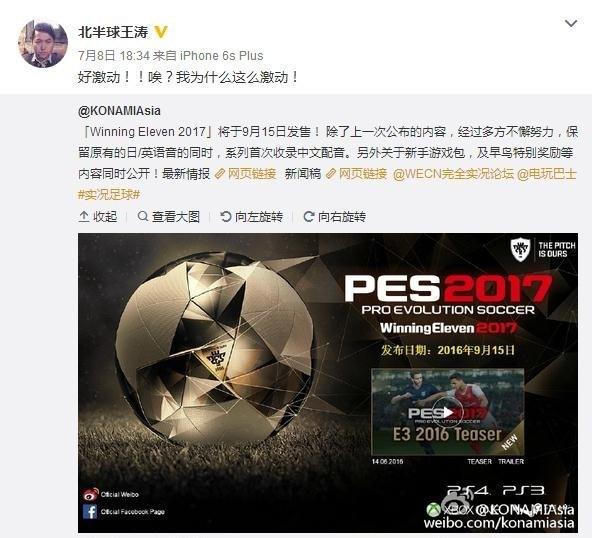 按计划,《实况足球2017》将于9月13日发售,登陆PS4、Xbox One和PC,相信有了官方中文揭面和普通话解说的《实况足球》能够给更多中国玩家带来更为真实,逼真的足球享受。