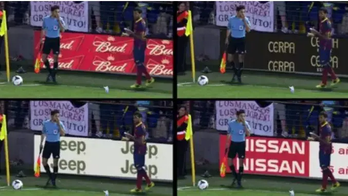 以一场巴萨的比赛为例,在角球的同一时刻,法国、巴西、美国和阿尔及利亚这四个国家的转播信号里,场边的LED所显示的就是不同品牌的广告,其广告语也使用了不同的语言文字。