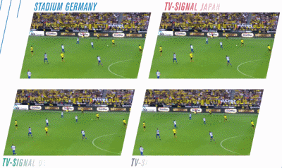 德甲虚拟广告,左上为实际球场画面 其余为日本、美国和中国的电视转播画面