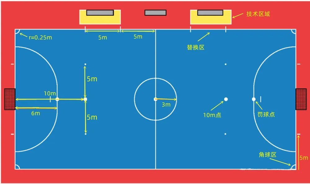 下图为五人制足球场地具体尺寸标准: