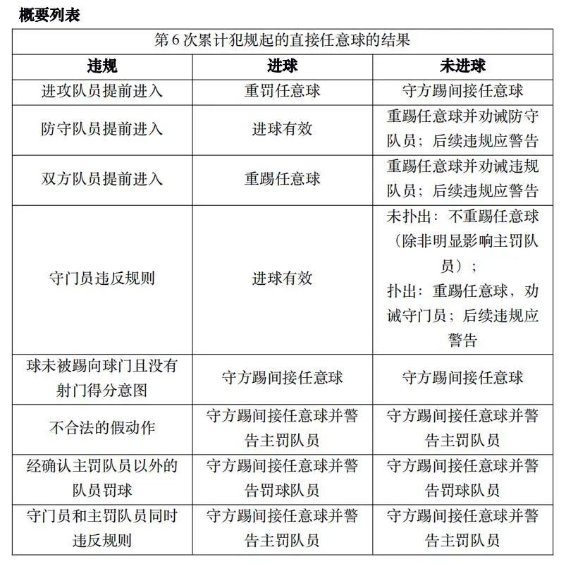 • 第6次累计犯规起的直接任意球可以直接得分,主罚队员应以射门为目的。