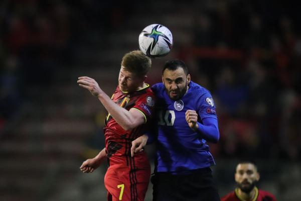 ↑比利时队球员德布劳内(左)与爱沙尼亚队球员岑约夫在比赛中争顶。