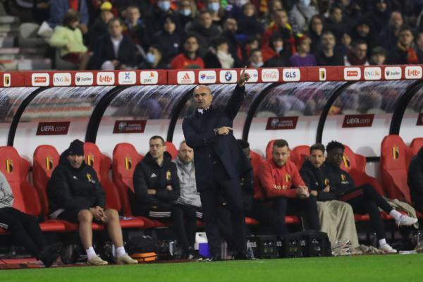 ↑比利时队主教练马丁内斯(前)在比赛中指挥。