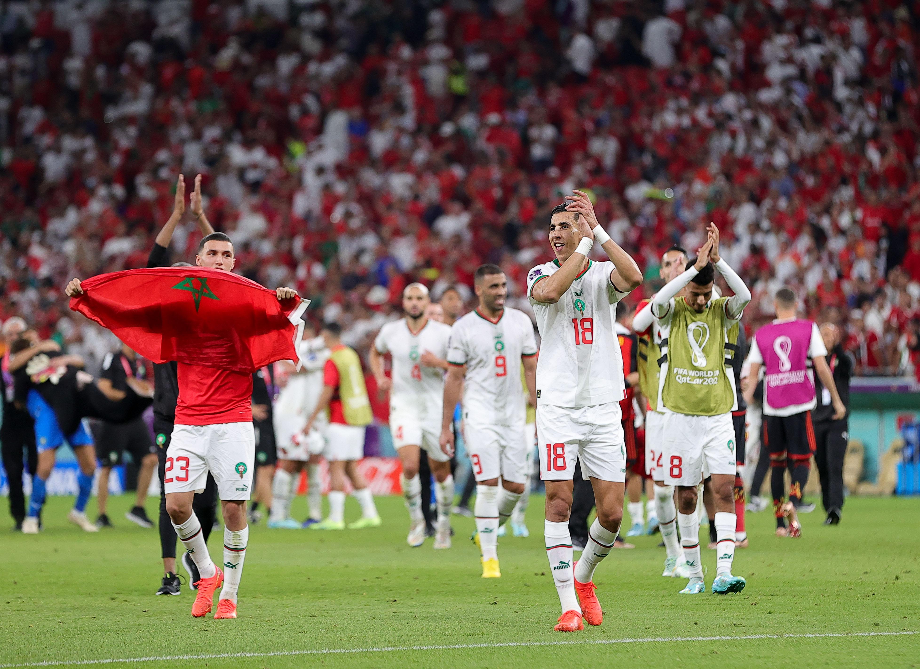 11月27日,摩洛哥队球员在2比0击败比利时队后向观众致意。新华社记者王东震摄