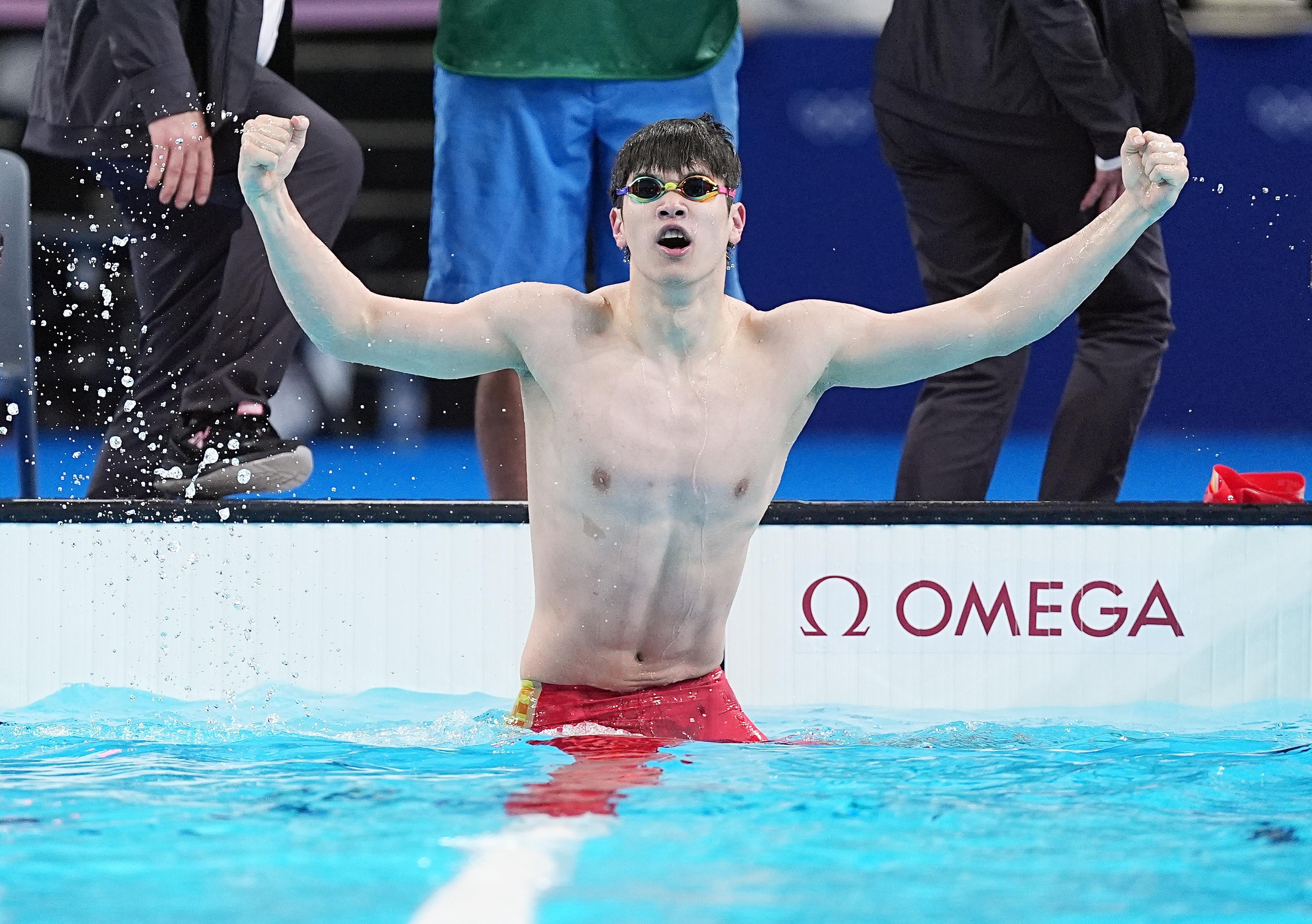 7月31日,在巴黎奥运会游泳项目男子100米自由泳决赛中,中国选手潘展乐以46秒40的成绩夺冠并打破世界纪录。图为潘展乐在赛后庆祝。新华社记者 杜宇 摄
