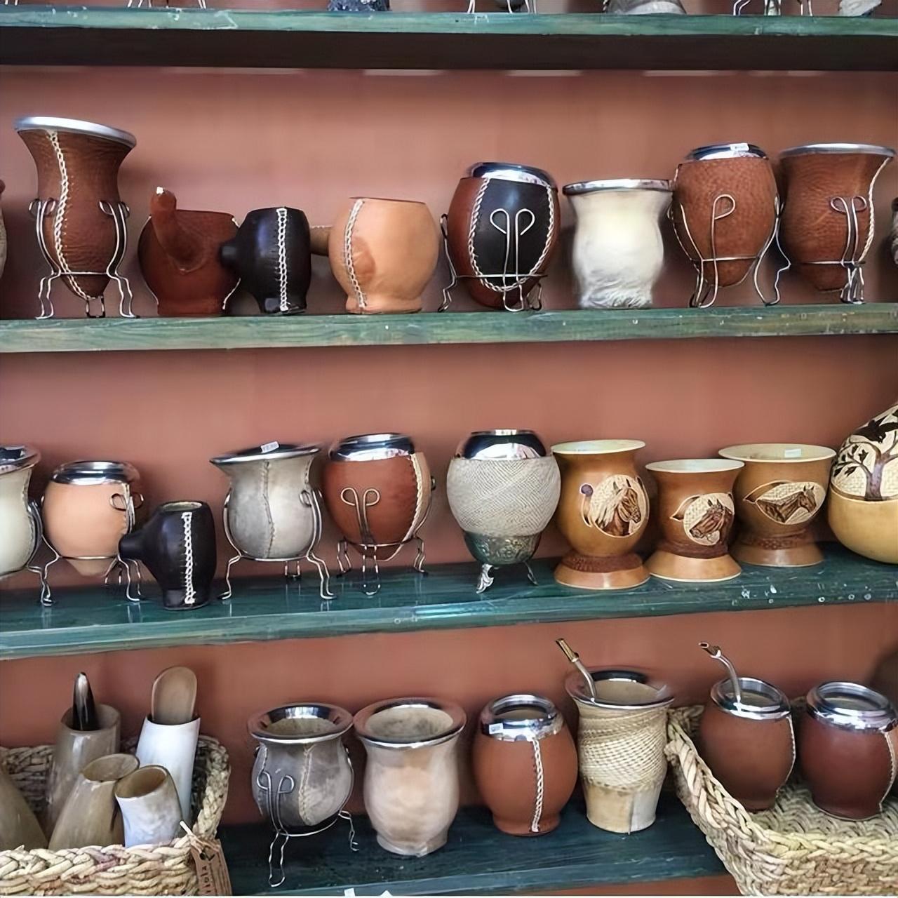 喝马黛茶还要配有专门的工具马黛茶杯,因为喝茶的人太多,所以马黛茶杯也有各种材质来制作,款式多不胜数,一般有:玻璃内胆加上皮制外层的;全木制(角豆木algarrobo)的;葫芦制加上皮制外层的;全木质加上镍银外层的等等。