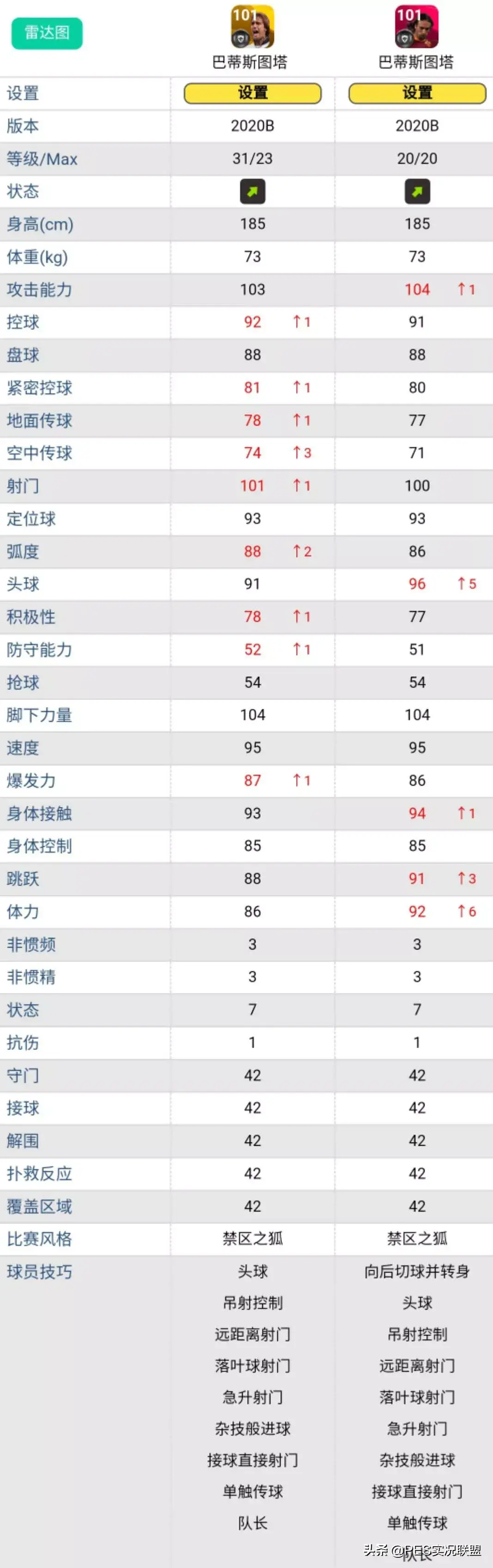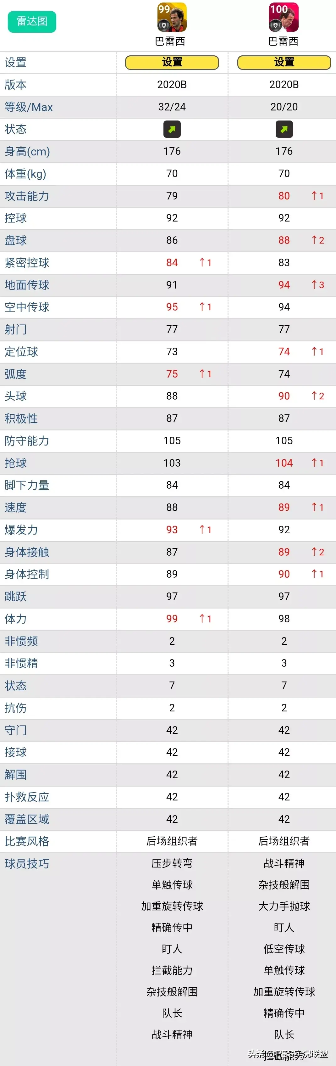 前面已经提到,目前最关键的问题是具体某个传奇能够突破多少级现在还不确定,所以我们只能统一用黄传球员突破8级后的属性来对比。
