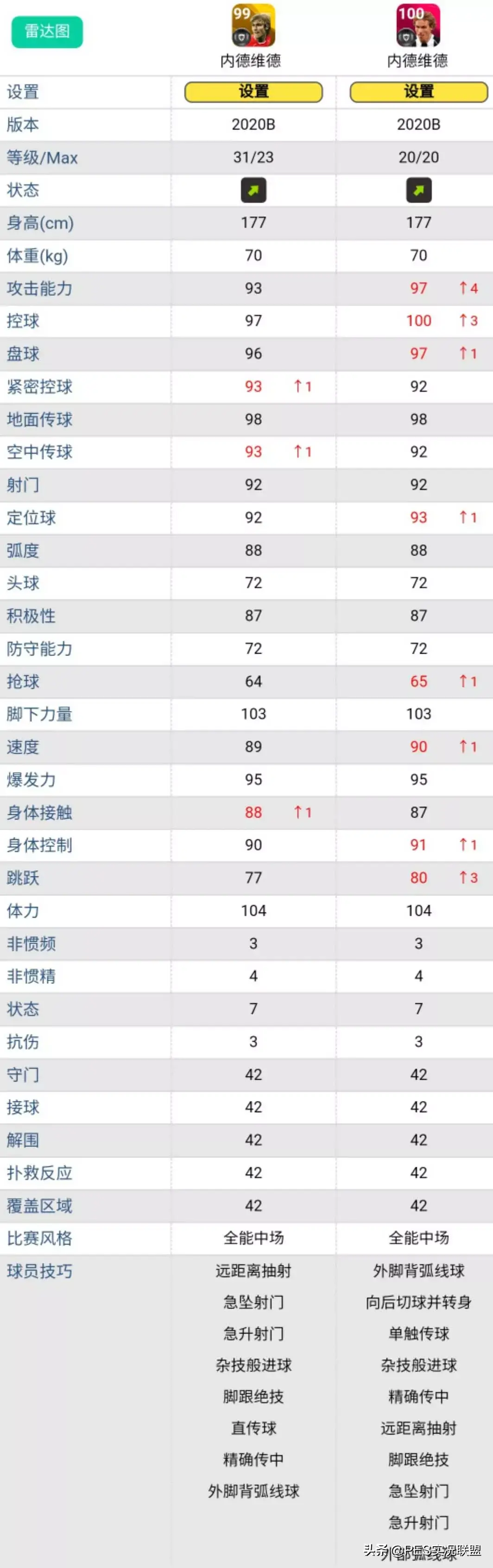 球员简述:时刻卡内德维德相当于进攻加强版的黄传,而且自带了单触和切球转身两个神技,黄传内德维德只突8级仍然无法在实力上与之对等,而且即使最终拥有更高的突破等级,能不能刷出单触还得两说。