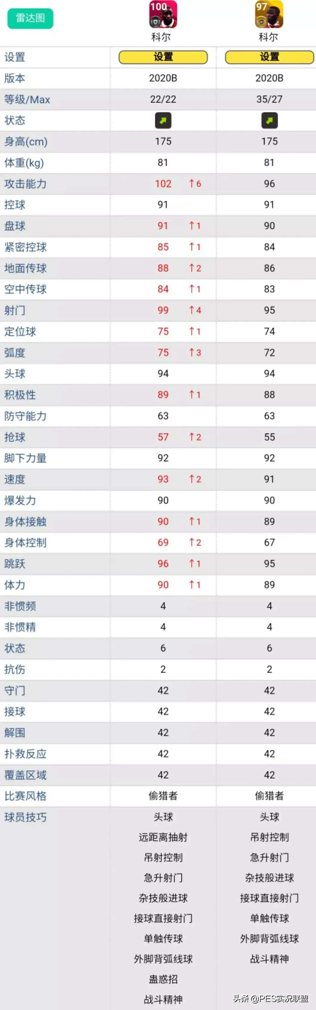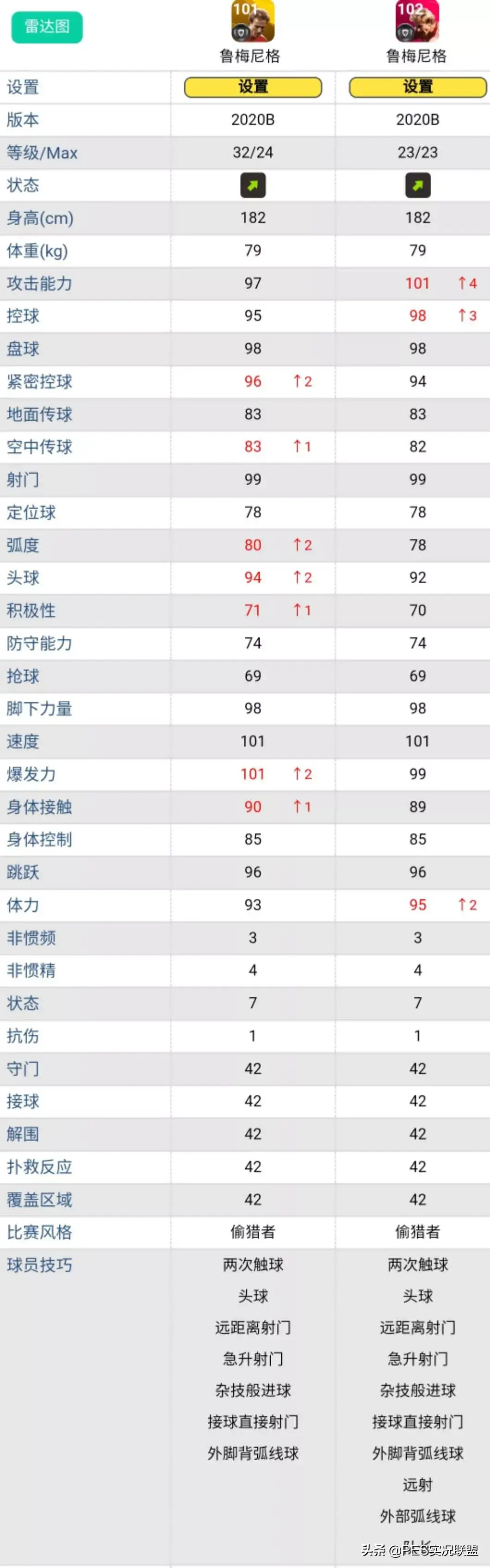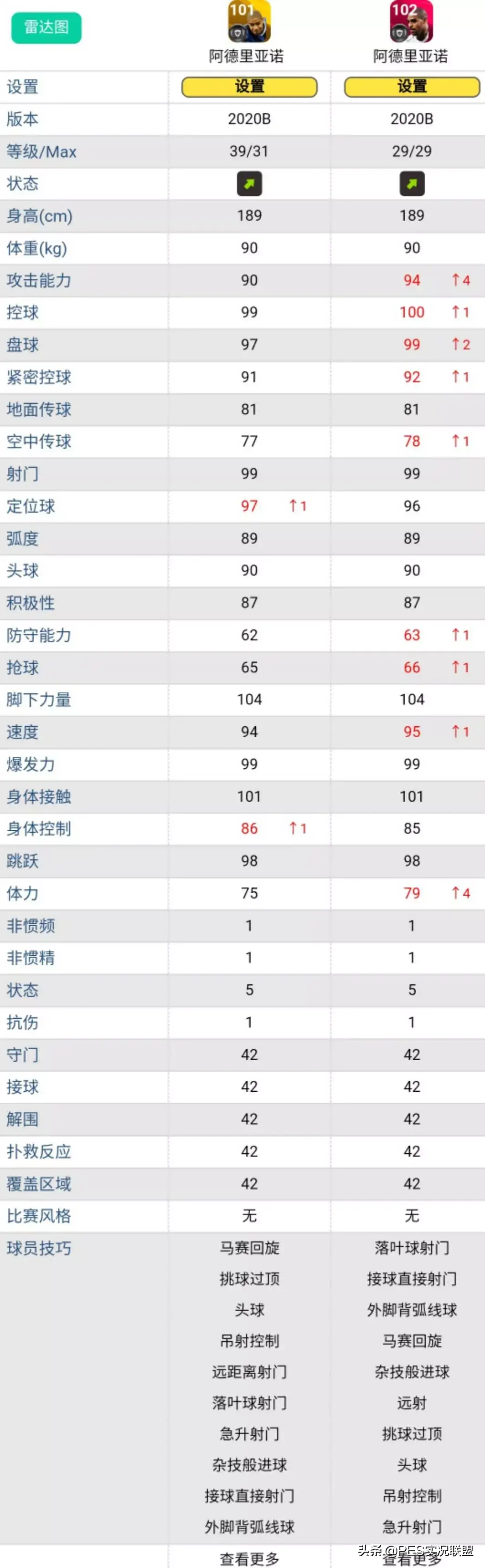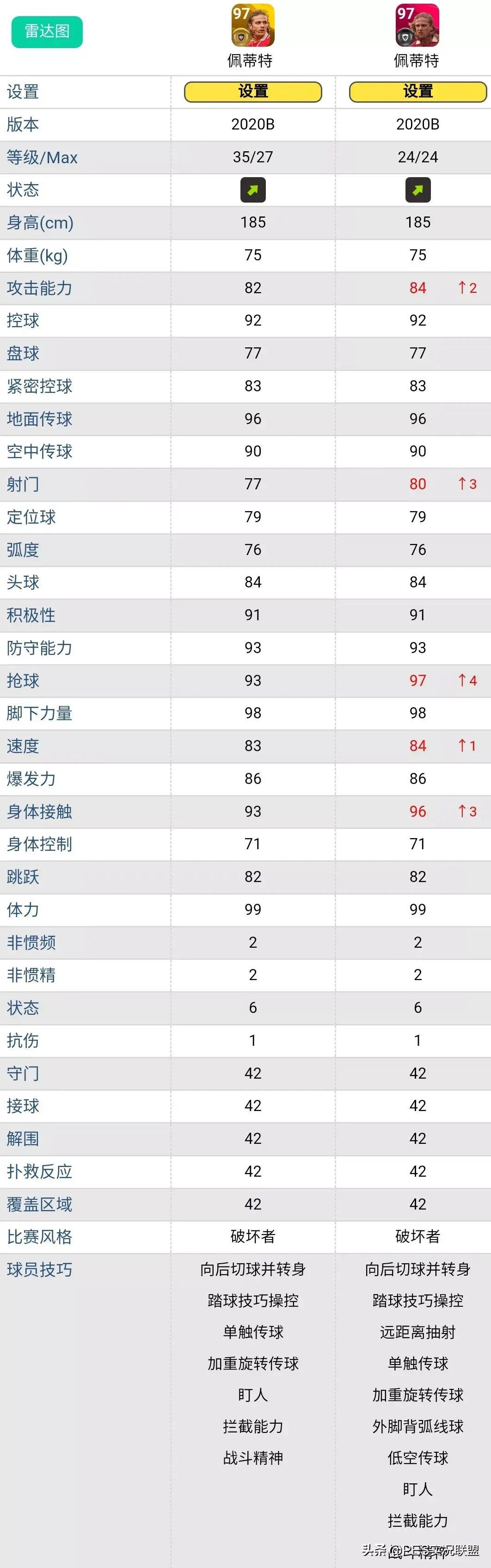球员简述:黄传皮耶罗如果只能提升8级上限,跟时刻卡还有一定差距,属性方面主要是双传水平差的比较多,技能上也少了踏球技巧操控和两次触球,在手感上有区别。而且“踏球技巧操控”是游戏中经常被忽略的一个神技,这个技能可以令“球员使用后脚停球或带球转身时控球更佳”,从字面意思就不难理解它的重要性。