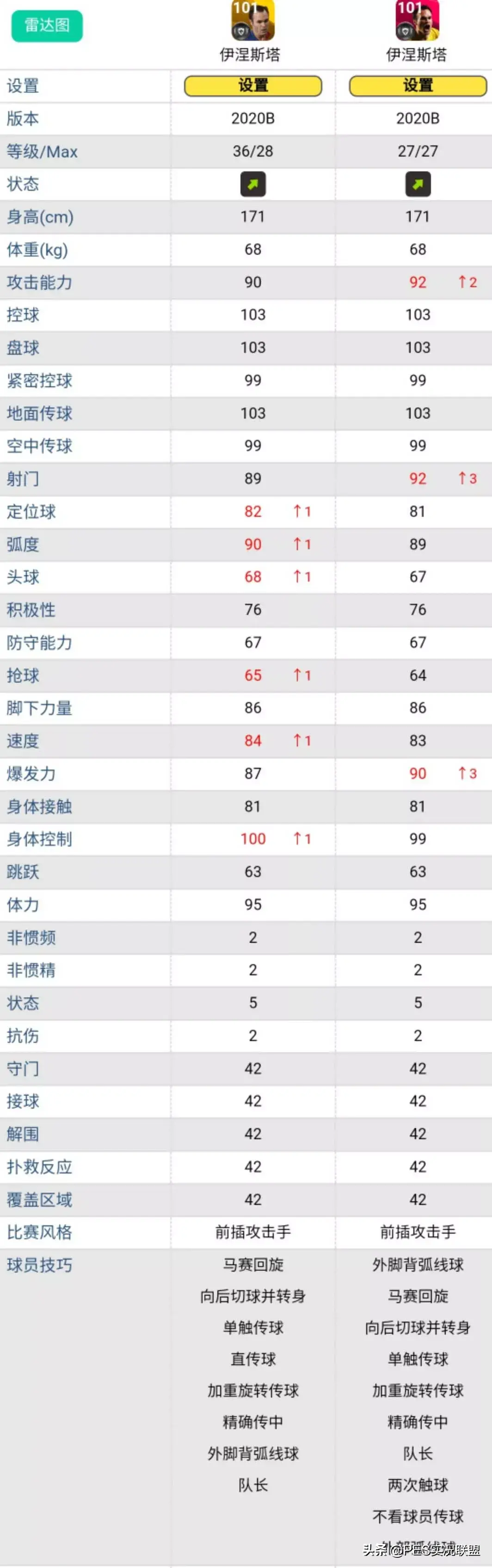 球员简述:黄传伊涅斯塔突满8级后,虽然理论总评与时刻卡一致,但黄传优势不大,强项都是+1,并且有很多非关键属性提升,而时刻版本的攻击、射门和爆发都是关键属性。另外,时刻卡小白还自带了标志性的“油炸丸子”(两次触球)。