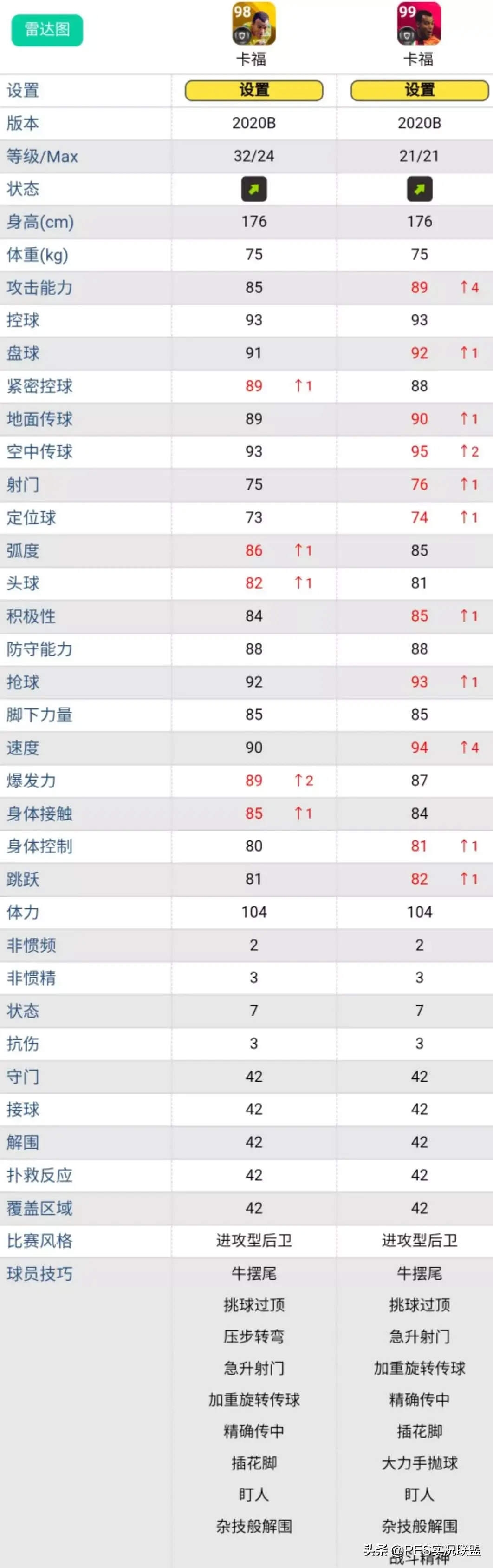 球员简述:时刻卡福单就速度高4点一项数据,就是黄传卡福突破8级也无法对等的属性,而且时刻版本还多了战斗精神和大力手抛球两项技能。