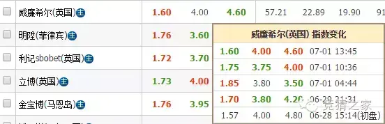 韦德同样的,变化方式跟威廉有异曲同工之妙,但是还是被笔者的“分散学说”击溃。理论与实际结合,因欧洲三大公司中的两者均已被击溃,另一公司的赔率无论如何开,该赛事赛果也是到了不攻自破的一种境地。综合判断主队不胜,在此,笔者大概分享一下另外一种核心思维---“便宜理论”,大致说一下其意思内容为:没有任何一个菠菜公司是会轻易给玩家肉吃的。以后对“便宜理论”详细讲解。该场赛事运用“便宜理论”直接排除主负,定胆:单1,平局。