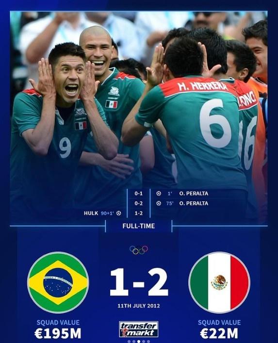 2012年伦敦奥运会:佩拉尔塔开场28秒闪击,第75分钟梅开二度,胡尔克在补时第1分钟扳回一城,墨西哥2-1巴西